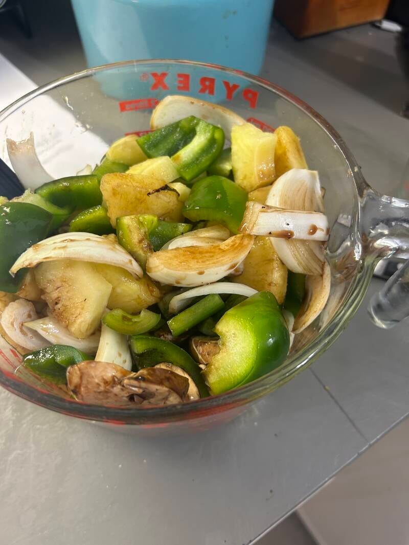 - Prepare the Vegetables and Pineapple: Put the bell peppers, onion wedges, mushroom slices, and pineapple pieces in a large mixing bowl .