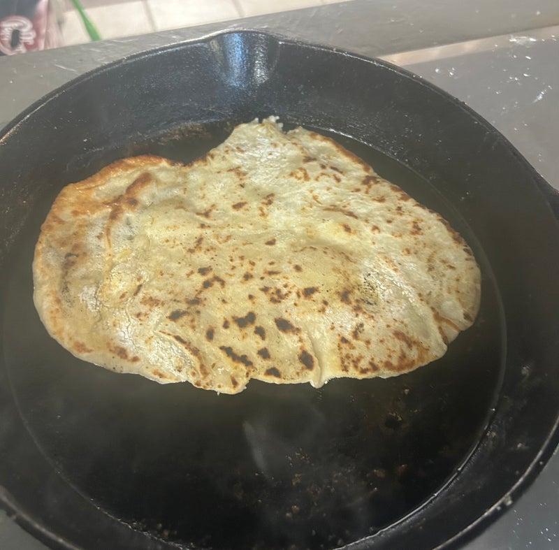 - Place one rolled-out dough piece onto the hot skillet. Cook until bubbles form on the surface and the bottom is golden brown, about 1-2 minutes.