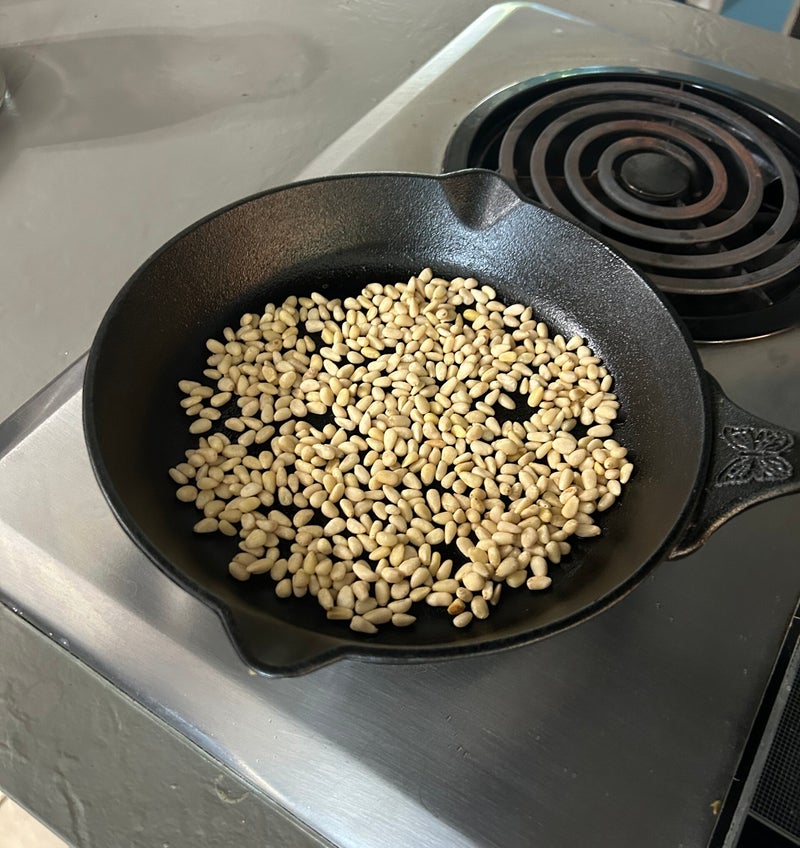 For one batch (which will fill up half of an ice cube tray) you'll want to wash and dry about two cups of fresh basil leaves. We toasted the pine nuts in a cast iron skillet, this really brought out the flavor in the nuts. In a food processor, combine the basil with two cloves of garlic (we cut these in half), 1/2 cup of pine nuts, and 1/2 cup of freshly grated Parmesan cheese. If you want to add any other fresh herbs go ahead an put them in. Pulse these ingredients until they are finely chopped.